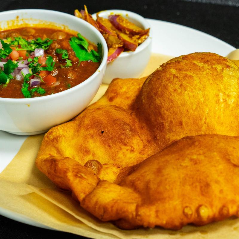Samosas, chickpeas, onions, tomatoes, yogurt, mint and tamarind sauce