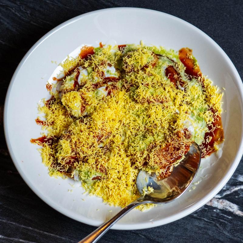 Potato patties, onion, tomatoes, yogurt, mint and tamarind sauce